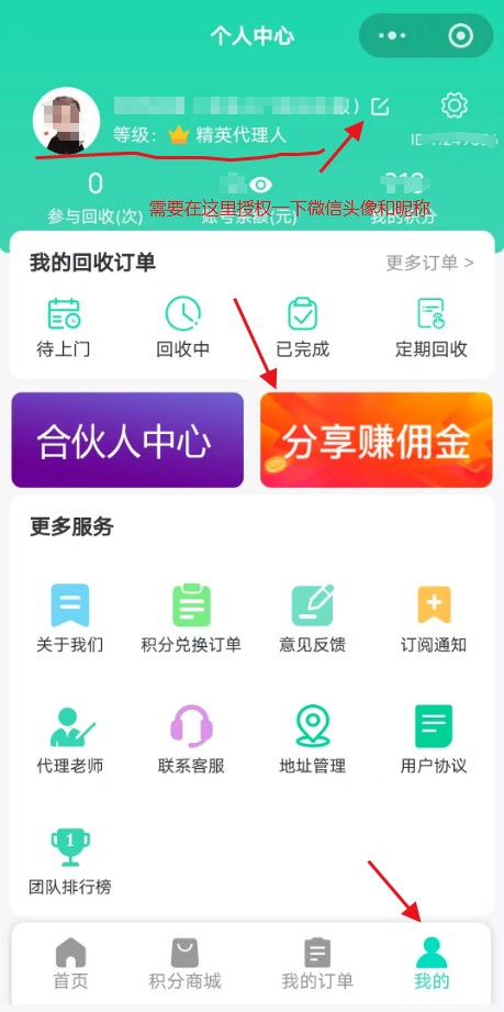 完成授权:进入小程序后,点击 “我的”,找到头像右侧小方框,完成微信昵称和头像授权,未授权则无法获取佣金;